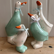 Each figurine is lovingly hand-painted and adorned with cheerful teal polka dots and matching teal booties. Standing at around 10cm tall, these charming duck figurines feature delightful details, including soft foot pads and a coordinating ribbon bow.